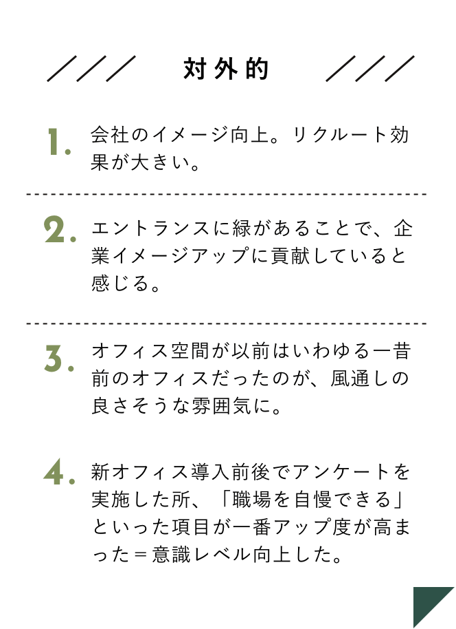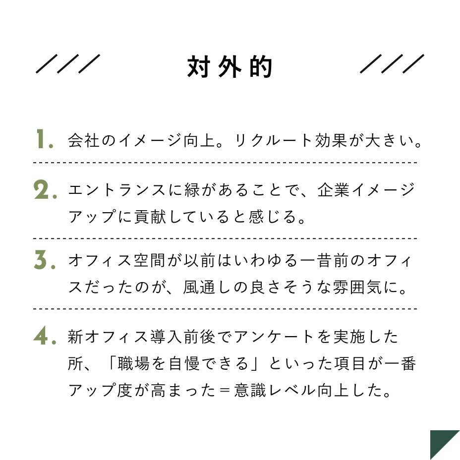 「オフィスが緑化されることによる企業のメリットは?」というアンケートによると、社内外でプラスの効果があるようです。