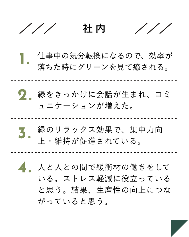 この時代に注目されているのがオフィスの緑化です。コミュニケーションの円滑化や疲労感の緩和、生産性の向上など様々な結果が報告されています。